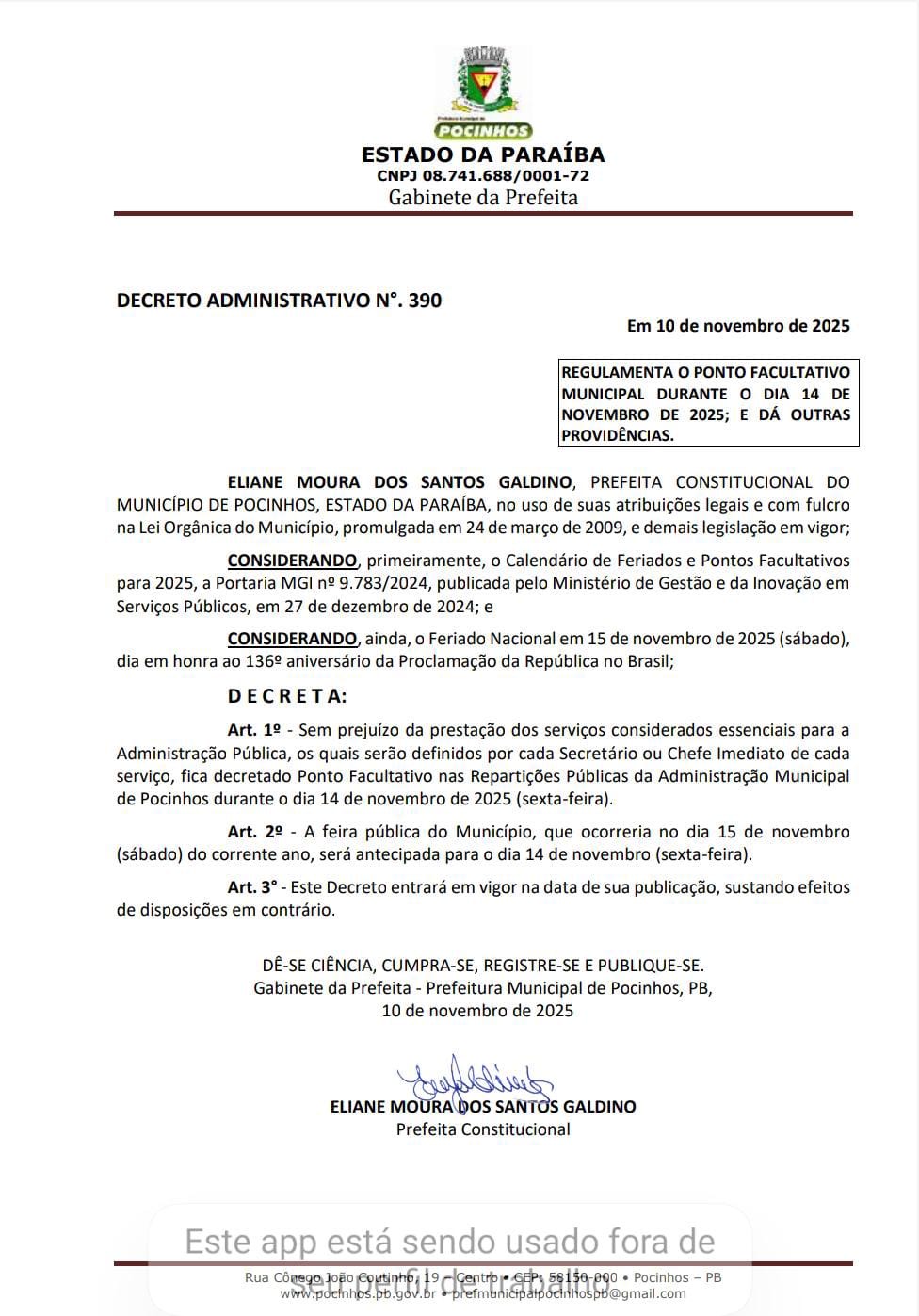 A Prefeitura Municipal de Pocinhos informa que a sexta-feira, dia 14 de novembro, será ponto facultativo nas repartições públicas municipais, em virtude do feriado nacional da Proclamação da República, comemorado no dia 15 de novembro (sábado).