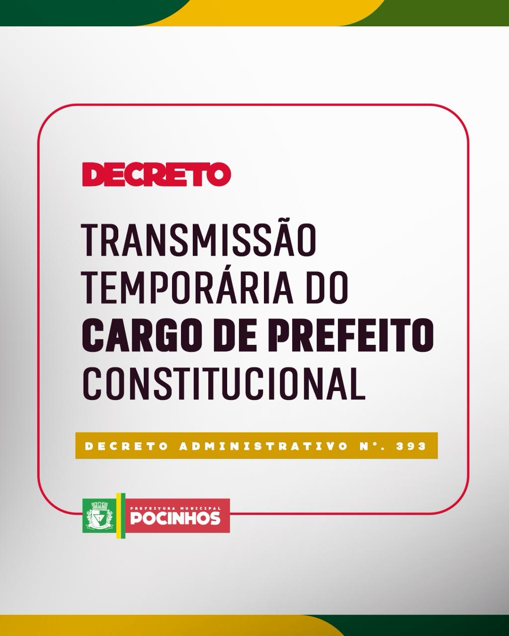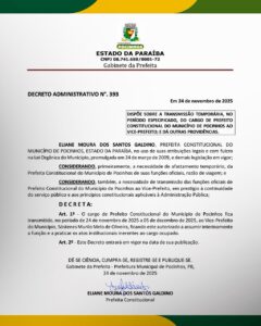 A Prefeitura Municipal de Pocinhos informa que, no período de 24 de novembro a 05 de dezembro de 2025, o cargo de Prefeito Constitucional será exercido pelo vice-prefeito Sóstenes Murilo Melo de Oliveira. A transmissão de cargo foi realizada de acordo com as normas legais, garantindo a continuidade administrativa e o pleno funcionamento dos serviços públicos.